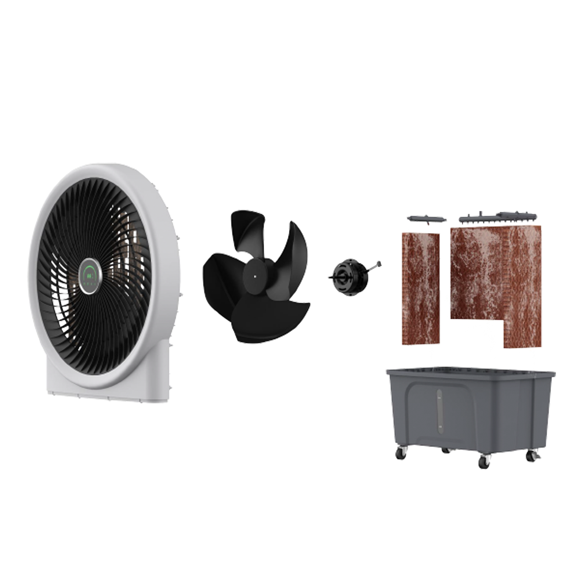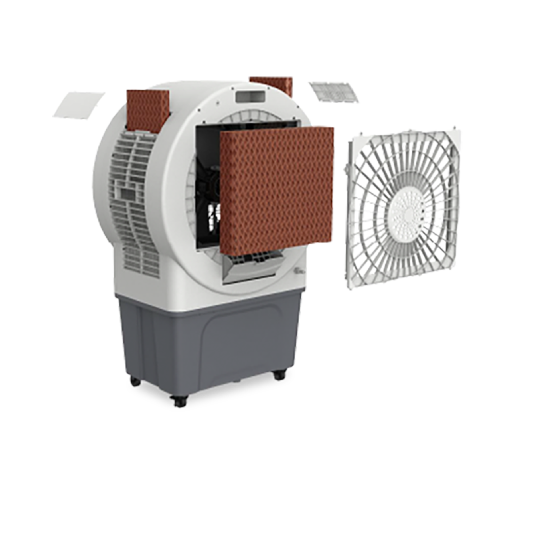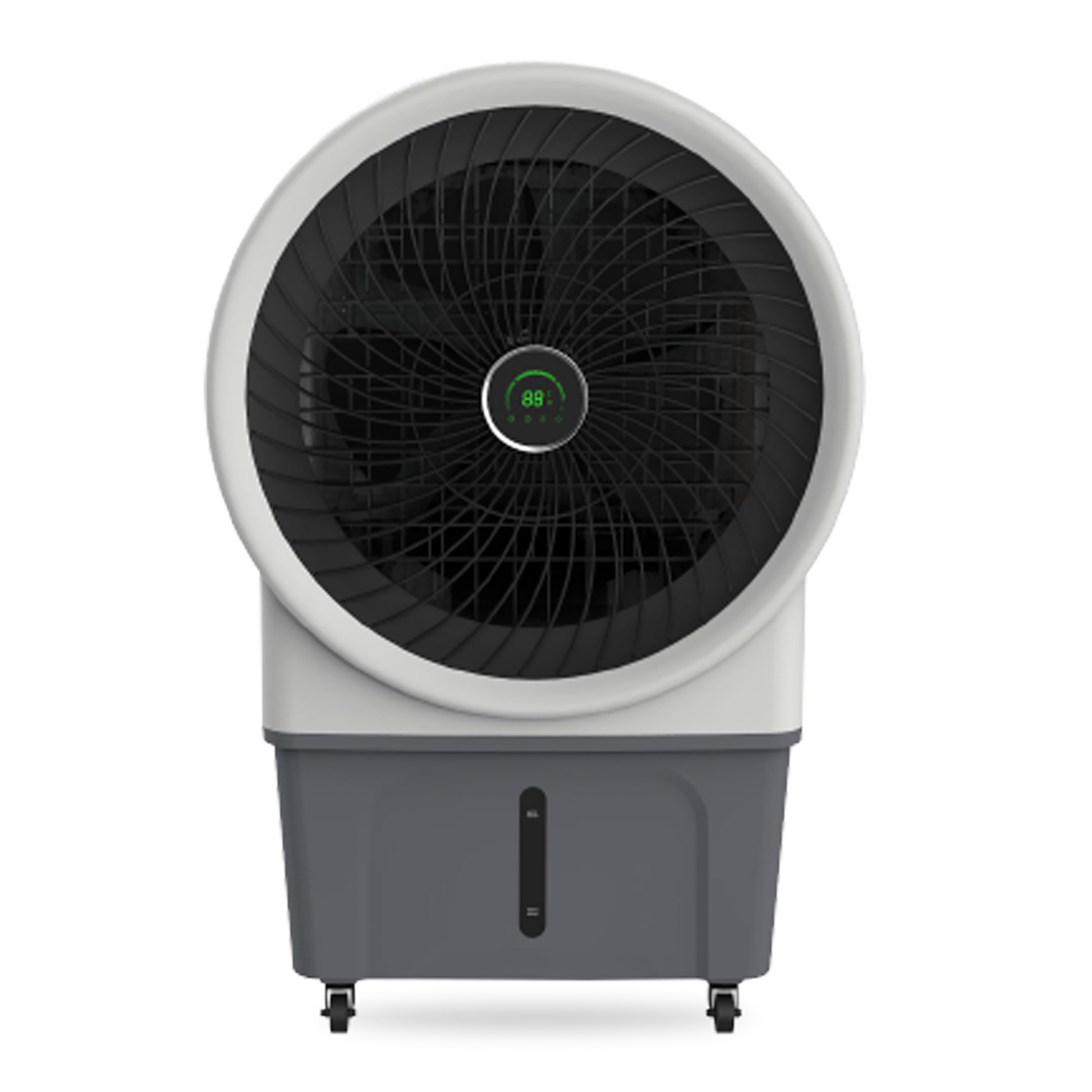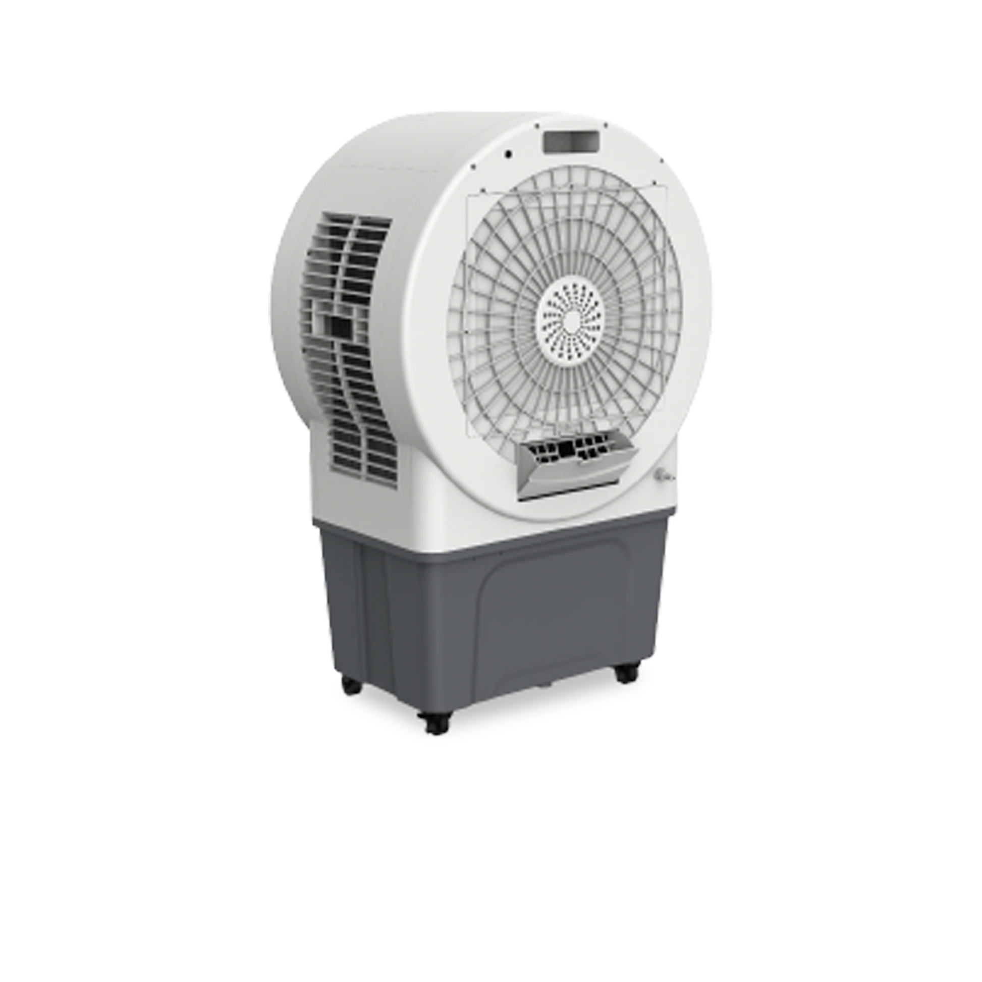 Works in areas of 400-500m3, Ideal for areas of 25m, with a wind speed of 9 meters per second and an airflow of 6000m3 per hour. It has a 250W powerful pump and a 20-inch black-oxidized aluminum blade with an RPM of 1200 per minute. Has a Honeycomb cooling pad that is easy to remove to be cleaned. Has touch buttons and works with a remote control. The LCD has temperature, 1 - 12 hours timer, and 1 - 12 hours presetting. The air inlet area is 4000cm2 and the air outlet area is 2500cm2. 3 sides let warm air in and 1 side emits cool air. The large water tank holds 80L of water. Refill manually, by hose pipe, or directly from the tap. Use in shops, airport stations, exhibition centers, warehouses courtyards, and lobbies.